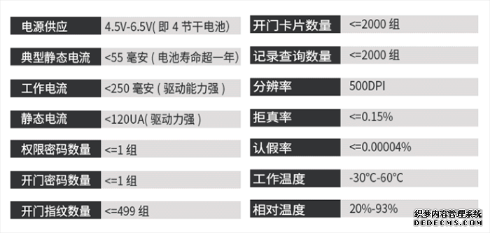 | 电源供应: | 4.5V-6.5V(即4节干电池 | 开门卡片数量: | <=2000组 |