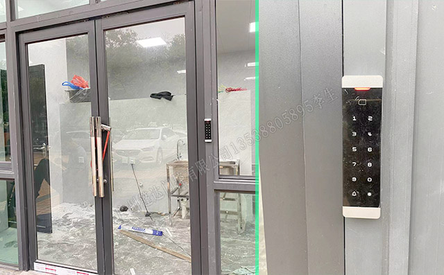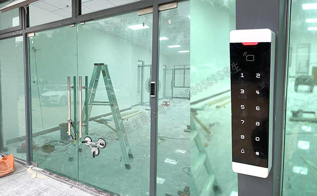 广州市天河创意园区办公室玻璃门铝合金边框玻璃门,由于边框比较窄,所以合适安装窄边门禁机