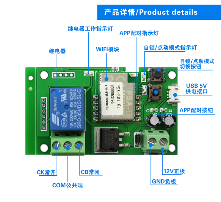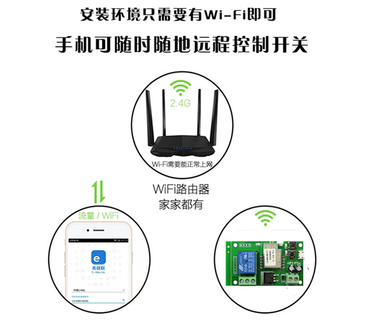 此模块采用WIFI中继控制电路,只需有联网WIFI信号即可安装;可以控制门禁,电锁改装各