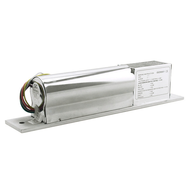 五线低温型门禁系统电插锁/电控锁采用领先的超低功耗及超低温线圈设计,具有工作电流仅仅0.10A,从而极大的延长了使用寿命,并且将故障发生的可能性降到最低。技术领先,品质领先的优质电锁,目前门禁电插锁安装/维修/更换使用较多。本门禁系统电插锁采用直流电机作为动力,力矩大,工作电压范围宽,电流小,工作温度低,使用寿命长,经现场安装使用测试达50万次以上;带锁芯检测及门状态检测,当未能准确上锁时,即发出哒哒...的报警声,保护功能完善,是各企业办公场所门口管制管理的理想选配。