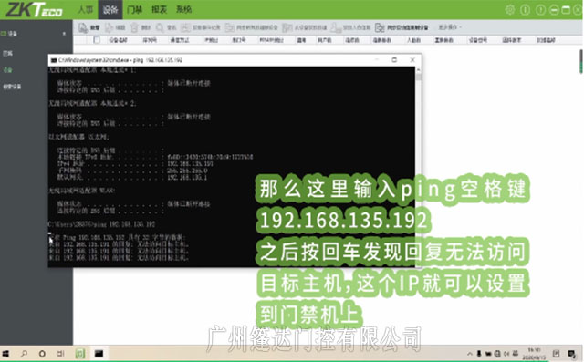 4)找一个IP给门禁机使用:门禁机IP地址需和电脑在同一网段,门禁机IP地址以电脑IP地址来更改,前三位与电脑IP一致,最后一位不同,刚才电脑IP为192.168.135.191,那么门禁机IP可以设置为192.168.135.XXX(最大254),这里预设为IP为:192.168.135.192;输入完成之后按回车。输入ping空格键ip地址回车,这里输入ping 192.168.135.192之后按回车发现回复无法访问目标主机,这个IP就可以设置到门禁机上(注意:如果有多台设备,每台设备的IP地址要)。
