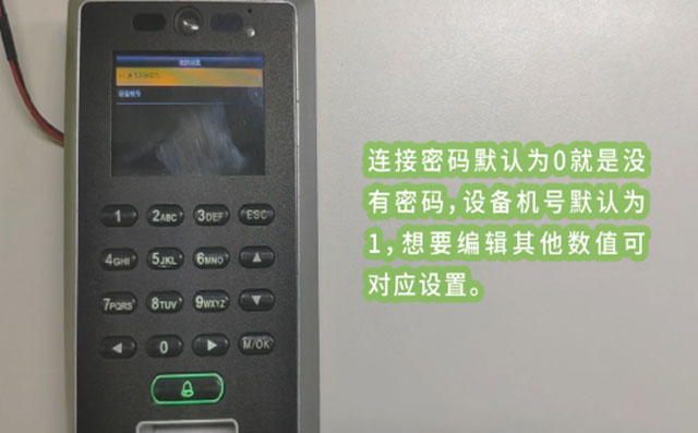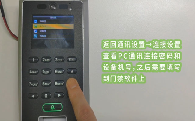 3)返回通讯设置→连接设置,查看PC通讯连接密码和设备机号,之后需要填写到门禁软件上,连接密码默认为0就是没有密码,设备机号默认为1,想要编辑其他数值可对应设置。