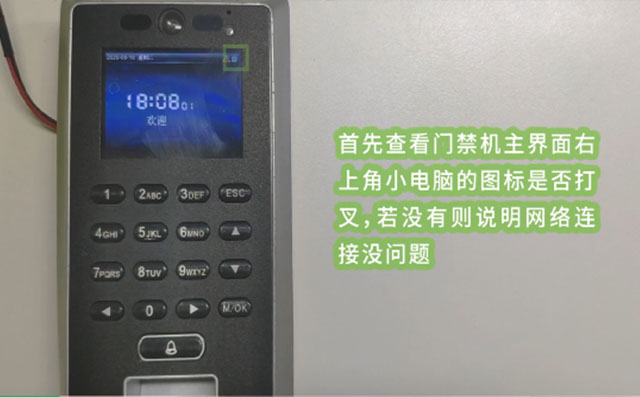 1)首先查看门禁一体机主界面右上角小电脑的图标是否打叉,若没有则说明网络连接没问题;