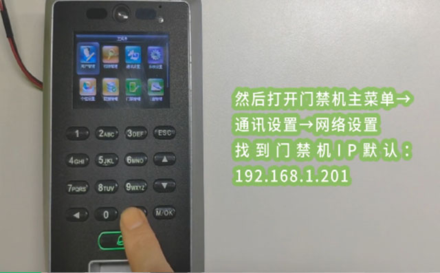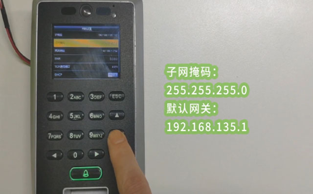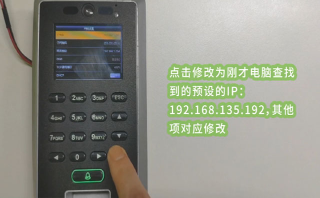 2)然后打开门禁一体机主菜单→通讯设置→网络设置,找到门禁一体机IP默认192.168.1.201,点击修改为刚才电脑查找到的预设的IP:192.168.135.192,其他项对应修改,例如这里设置为
